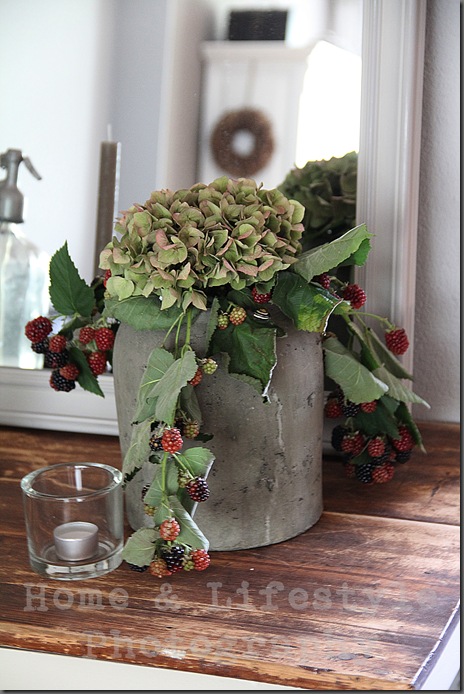 De pot heb je heel mooi opgemaakt met bramen en een hortensia, een blikvanger!
