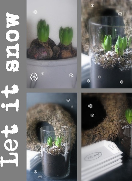 Ik weet niet hoe ik dit jaar het eerste sneeuwvlokje ga ervaren, maar in huis maak ik – sneeuw of geen sneeuw - al een klein sprongetje naar het voorjaar. In de glazen vaas staan hyacinten, voorzien van een laagje sneeuw maar eenmaal in bloei ook een voorteken van een nieuw seizoen dat na de winter op ons staat te wachten.