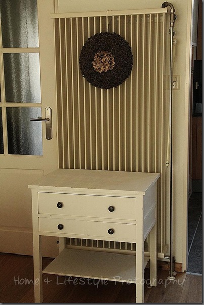 Er werd op manlief ingepraat, net zolang totdat ik het mocht gaan regelen ;)! En omdat wij vrouwen graag vooruit denken, ging het witte kastje er uit en kwam onderstaand tafeltje er een paar weken geleden in, al voordat de radiator verwijderd was. Onze vriend Henk – die de tafel heel lief voor mij elders in Nederland ophaalde – begreep geloof ik maar weinig van mijn aankoop, zijn woorden dat hij er zelf nog geen 5,= euro voor had gegeven zeiden in ieder geval genoeg ;).